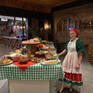 Um jantar típico com o melhor da culinária ITALIANA apresenta uma diversa e excepcional variedade de pratos. A tradicional culinária Italiana com muitas massas, queijos excelentes, diversas saladas, linguiças, o famoso salame italiano caseiro, vinhos de alto nível e diversas sobremesas.
